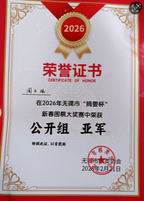 2026年无锡市新春围棋大奖赛,聚集了无锡一众围棋好手,既有曾可与业余天王级人物比肩的业余围棋世界冠军棋手,也有不少新生代青少年围棋6段才俊。大家同场楸枰竞技,其乐融融。本次比赛冠军奖金丰盈,不逊于全国公开赛的四强奖项。本网站的网课老师周子涵,此次比赛发挥的中规中矩,不过运气稍稍欠佳。比赛成绩在大分小分和胜对手分都完全相同的情况下,以2个对手分顺减的微弱之差,屈居新春大奖赛公开组亚军。
