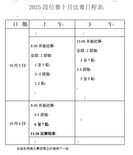 3.定升段赛成绩计算办法:成绩积分高者名次列前。积分相同,比较对手分区分名次,对手分高者名次列前;若仍相同,各组均依据下列顺序区分名次。
