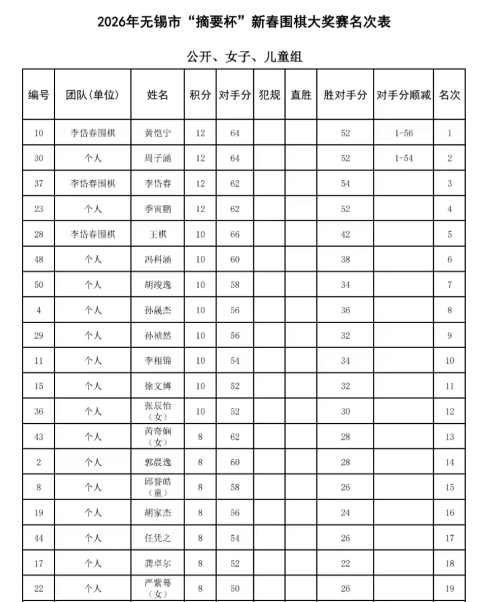 2026年无锡市新春围棋大奖赛,聚集了无锡一众围棋好手,既有曾可与业余天王级人物比肩的业余围棋世界冠军棋手,也有不少新生代青少年围棋6段才俊。大家同场楸枰竞技,其乐融融。本次比赛冠军奖金丰盈,不逊于全国公开赛的四强奖项。本网站的网课老师周子涵,此次比赛发挥的中规中矩,不过运气稍稍欠佳。比赛成绩在大分小分和胜对手分都完全相同的情况下,以2个对手分顺减的微弱之差,屈居新春大奖赛公开组亚军。