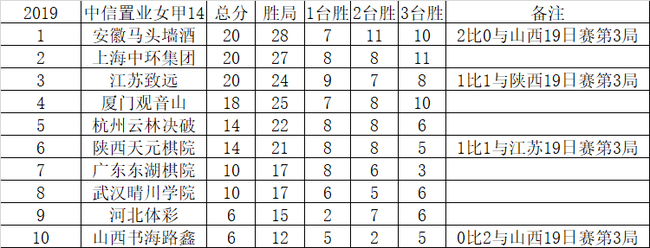 截止14轮比赛过后,安徽、上海、江苏(少赛一局)同积20分,厦门18分,杭州、山西同积14分,广东、武汉同积10分,河北、山西同积6分。